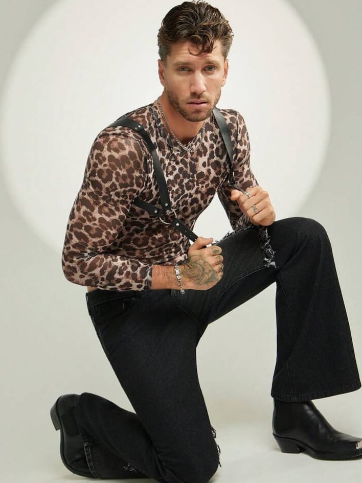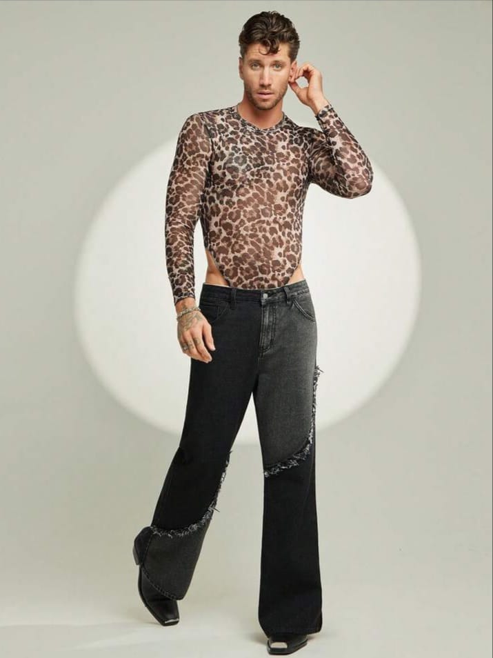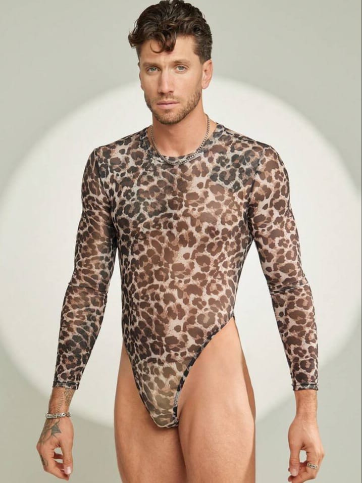 Men's Leopard Print Mesh Sheer Long Sleeve Bodysuit